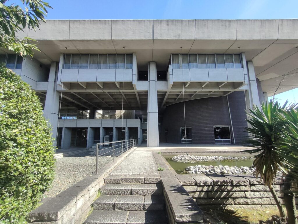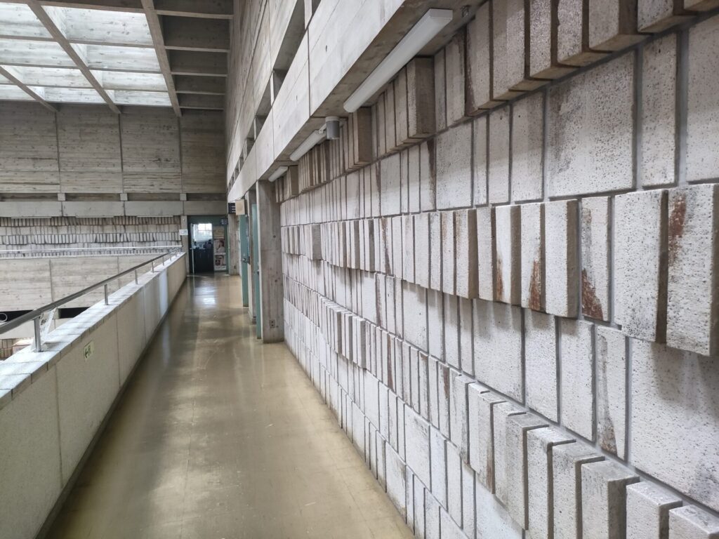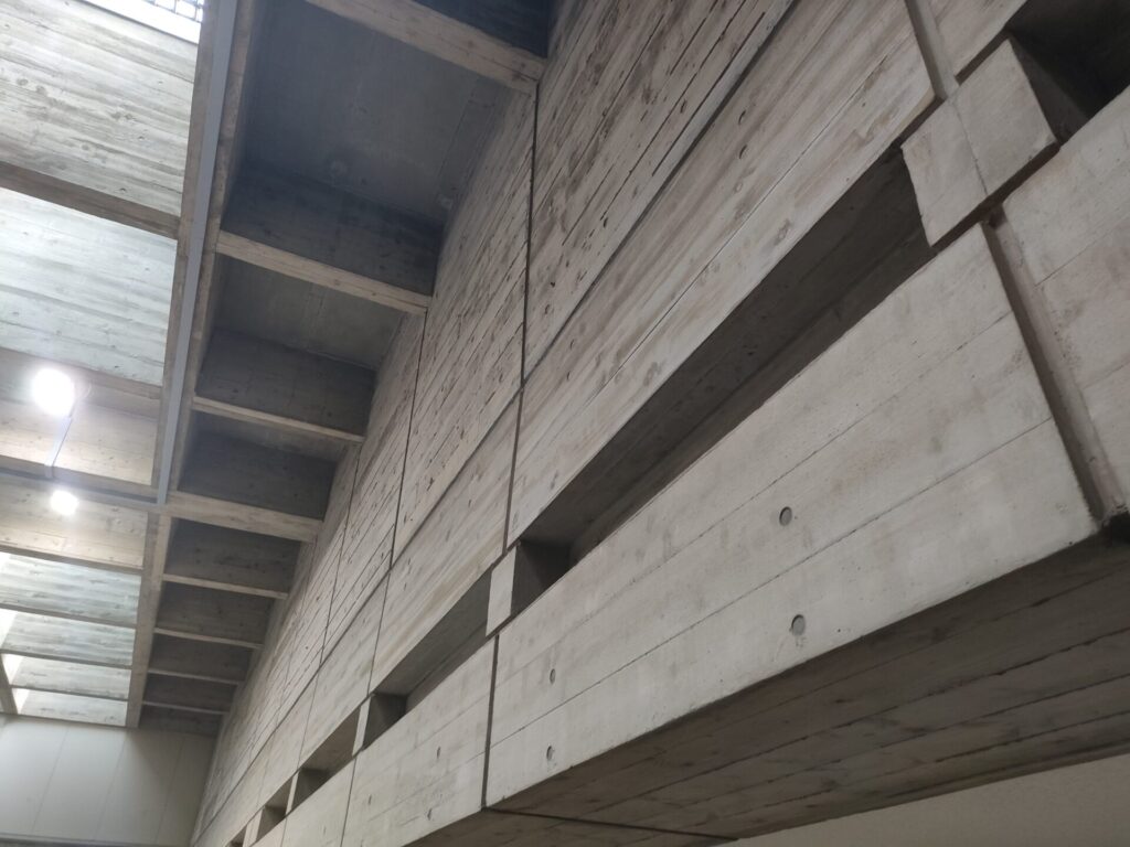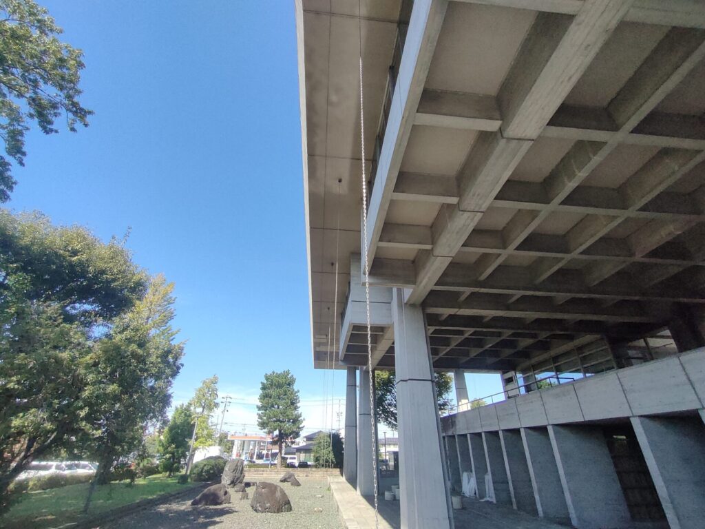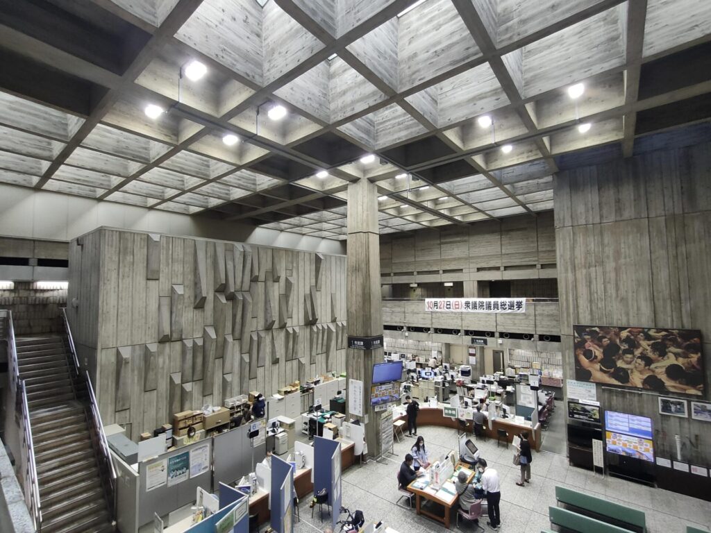 内外共に現れる格子梁の大屋根、円錐状のタイル張り議事堂とホール、外装内装ともに打放しコンクリート、格子状のトップライトから自然光が降り注ぐ三層吹抜けの受付待合は圧巻の空間です。予備知識なしで役所ヒアリングのために訪問しましたが、見所満載で、建物散策のほうに時間を費してしまう始末。後で調べるとゲンプラン設計で、1970年竣工とのこと。すでに54年が過ぎていますが、内外装共に竣工当時のままを維持している部分も多く、設計建設時の熱量をビシビシ感じる。荒々しくも緻密な設計はこれほどの月日を経ても、まだまだ陳腐にならないのだと実感する、何気ない日常