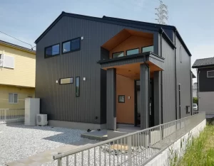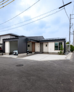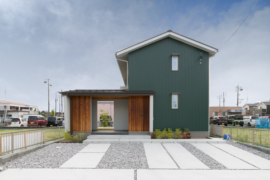 住宅が建て並ぶ分譲宅地において自然環境を取り込み、設備機器に頼りすぎない、環境にやさしい、明るい住宅を計画しました。屋根・庇による日射のコントロール、空調負荷低減、吹抜け利用による排熱、空調効率化を図っています。外観はシンプルな家型の住宅でありながら、玄関部分を近隣に開かれた顔として門構えすることで、玄関奥の庭のプライバシーも程よく守る形としました。